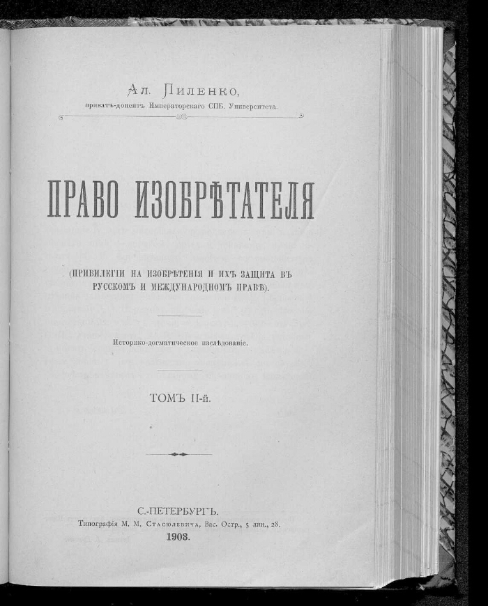 Pilenko, Alexander Alexandrovich (1873-1920).The right of the inventor: (privileges for inventions and their protection in Russian and international law): Historical and Dogmatic Research: [t.1-2] / al.Pilenko, Privat-Associate Professor of the Imperial St. Petersburg University.- St. Petersburg: Typography M. M. Stasyulevich, 1902-1903.-2 t .;24 cm. -.1. Power (collection).2. Inventive law - History - Russia.BBK 67.404.321Electronic Source: PBOriginal Storage Place: SPbSUT. 2. - 1903. -xii, 392 s .. -From the content: KN.2. The right to patent (end);Kn.3. Right from the patent;Afterword.Experience of the legal design of patent law..1. Power (collection).2. Russian invention: History Pages (Collection).3. Inventive law - History - Russia.4. Patent law - History - Russia.BBK 67.404.321BBK 67.404.321.1Electronic Source: PBOriginal Storage Place: SPbSU