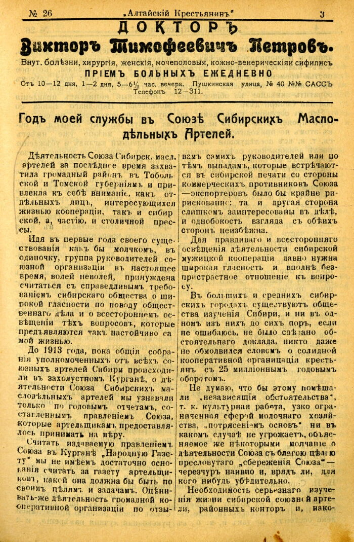 Author Курский Михаил Онисифорович Description Altai peasant. 1914. № 26 (July 5). - 1914. - . Source of the electronic copy: Altai KUNB Collections Domestic periodicals in the Presidential Library’s collections → Newspapers → A → Altai peasant. Barnaul, 1912-1918 → 1914 из 32