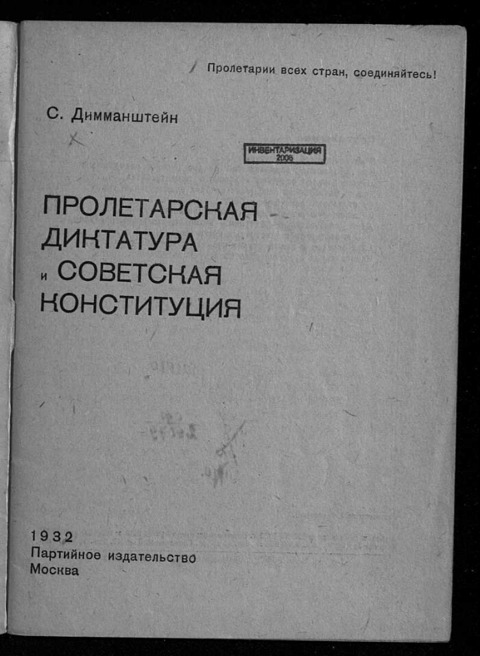 Dimanstein, Semyon MarkovichProletarian dictatorship and the Soviet Constitution.- M .: Partizdat, 1932. -31 s .. -On tit.l.Before the head.Aut.: S. Dimmanstein..I. Dimanstein, Semyon Markovich.Electronic copy source: PB