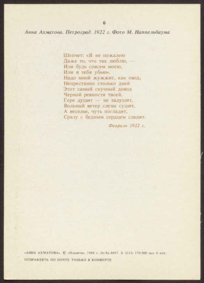 Anna Akhmatova: postcard / photo M. Nappelbaum / Nappelbaum, M. (photo).- Petrograd: Planet, 1923. -605: people..Electronic copy source: PB