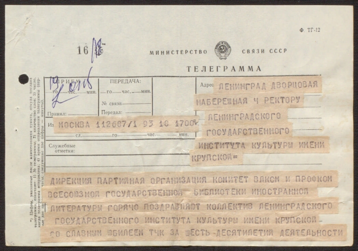 A telegram with congratulations in connection with the 60th anniversary of LGIK from the collective of the state library of foreign literature.- -.-605: people, territory..Electronic copy source: PB