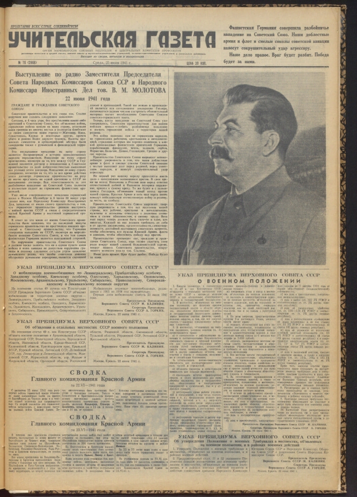 Teacher newspaper.06/25/1941 No. 76 (2868).- Moscow.-605: territory, people Agreement No. 146/23-GP of June 14, 2023.Electronic copy source: PB