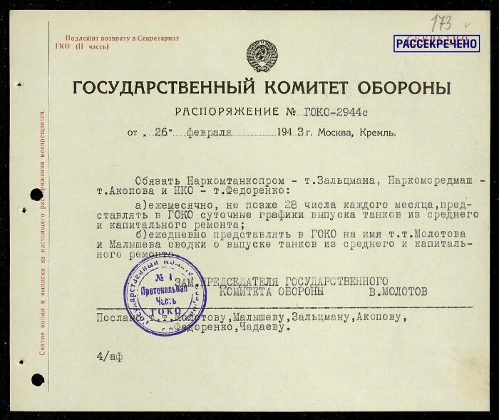 | Title | Order of the USSR GKO No. 2944 with the submission of daily schedules for the production of tanks, their average and overhaul of the People's Commissariat of Tank Industry and Medium Mechanical Engineering.February 26, 1943 |