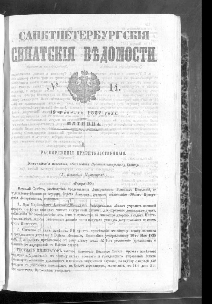 The St. Petersburg Senate. - St. Petersburg, 1809, Jan. 2 - 1892, Dec. 31 - Signed: 1809, No. 1 (Jan. 2) - 1892, No. 105 (Dec. 31) The St. Petersburg Senate; 1893 No. 1 (Jan. 1) - 1917, [?] Senate Gazette. adj: adj .: Senate announcements on state, government and court cases: department first and second. 1822-1917; Decisions of the cassation departments of the Governing Senate. 1866-1915; Decisions of the Criminal Cassation Department of the Governing Senate. 1867-1915; Collection of legalization and orders of the government, published at the Governing Senate: department first. 1863-1917; Senate announcements on state, government and judicial matters: Division Three. 1883-1917; Senate ads department is the fourth. 1883-1915; Ad. to individual numbers. 1822, 1830-1831, 1838-1867, 1869-1883, 1887-1917.