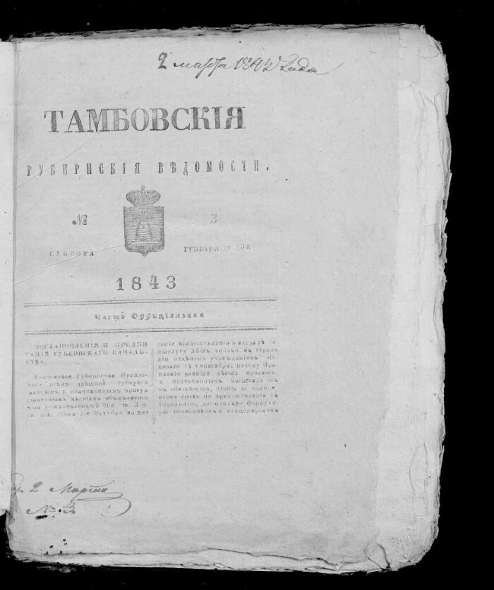 Tambov provincial statements.- 1838, January 8 - [?].-Tambov, 1838-1917.-The newspaper was published under the Tambov provincial rule since 1838. initially published weekly, from half of 1876 2 times a week, and from half of 1877 he went 3 times a week.From 1838 to March 1, 1907, 2 parts were published: official and unofficial;From 1838 to March 1845, the unofficial part was published as adding to the number.Bibliography: A pointer of articles placed in the informal department of the Tambov provincial statements for 1870 - 1877./ M. P. Grigorovsky;The pointer of articles placed in the informal department of the "Tambov provincial statements" for 1838 - 1840./ Solovsky V.V.;A pointer of articles placed in the informal department of the Tambov provincial statements for 1841-1842..1. Territory (collection).2. People (collection).3. Power (collection).4. Territory of Russia: Tambov region (collection).5. Domestic serial and continuing editions (collection).6. Tambov province - History - 19 - beginning.20 centuries.-- Periodicals.7. Russia - History - 19 - beginning.20 centuries.-- Periodicals.8. Newspapers - Russia - 19 - Nach.20 centuries ..BBK 63.3 (28-8TA) 52Я51BBK 63.3 (28-8TA) 53Y51BBK 63.3 (2) 52Я51BBK 63.3 (2) 53Y51Electronic Source: PBPlace of Storage Original: GATO1843, № 3 (January 16).- 1843. -s.: 7-10: Tab.+ Addition to No. 3 Tambov provincial velocity (p.: 6-7, [37]).-Ex.: No oblast, with a manus.litter..Electronic Source: PBPlace of Storage Original: GATO