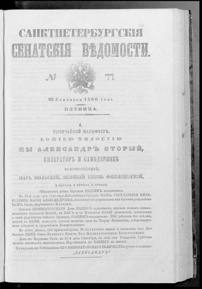 St. Petersburg Senate Vedomosti.- St. Petersburg, 1809, 2 Jan.- 1892, 31 Dec.-Titled: 1809, No. 1 (Jan.) - 1892, No. 105 (31 Dec.) St. Petersburg Senate Vedomosti;1893 No. 1 (Jan.) - 1917, [?] Senate Vedomosti.Al.: Senate announcements for government, governmental and judicial affairs: the first and second department.1822-1917;Decisions of cassation departments of the Governing Senate.1866-1915;Decisions of the Criminal Cassation Department of the Governing Senate.1867-1915;Assembly of legal entities and orders of the government, published under the Governing Senate: The first department.1863-1917;Senate ads on government, government and judicial affairs: the department is the third.1883-1917;Senate announcements department fourth.1883-1915;Arr.to individual rooms.1822, 1830-1831, 1838-1867, 1869-1883, 1887-1917..I. Russia.Senate.1.Russia.Senate - Activities - 19 - Nach.20 centuries.-- Periodicals.2. Domestic serial and continuing editions (collection).3. Power (collection).4. Legislation - Russia - 19 - NCH.20 centuries.-- Periodicals.5. Newspapers - Russia - 19 - Nach.20 centuries ..BBK 67.3 (2) 5Y51BBK 63.3 (2) 5-332Y51Electronic Source: PBPlace of Storage Original: Moscow Department1860, № 77 (September 23).- 1860. -16 s .. -A copy of the copy of the presidential library is not complete: there is no "Decrees of His Imperial Majesty, the autocrat of the All-Russian, from the Governing Senate, on the production of in the rank of service, approval in ranks and renaming to the ranks" (6 p.), "Form No. 1. Reporting statementAbout the arrival, consumption and balance of amounts allocated in 1860 on such a subject "(35 p.)..Electronic Source: PBPlace of Storage Original: Moscow Department