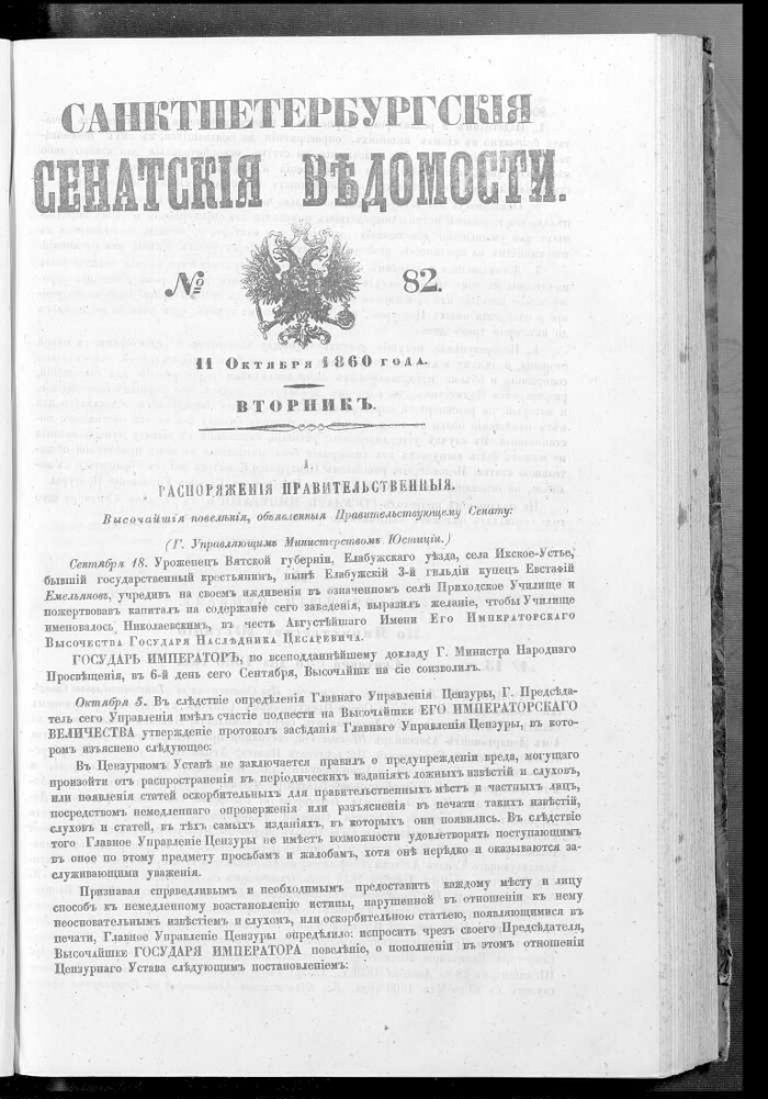 St. Petersburg Senate Vedomosti.- St. Petersburg, 1809, 2 Jan.- 1892, 31 Dec.-Titled: 1809, No. 1 (Jan.) - 1892, No. 105 (31 Dec.) St. Petersburg Senate Vedomosti;1893 No. 1 (Jan.) - 1917, [?] Senate Vedomosti.Al.: Senate announcements for government, governmental and judicial affairs: the first and second department.1822-1917;Decisions of cassation departments of the Governing Senate.1866-1915;Decisions of the Criminal Cassation Department of the Governing Senate.1867-1915;Assembly of legal entities and orders of the government, published under the Governing Senate: The first department.1863-1917;Senate ads on government, government and judicial affairs: the department is the third.1883-1917;Senate announcements department fourth.1883-1915;Arr.to individual rooms.1822, 1830-1831, 1838-1867, 1869-1883, 1887-1917..I. Russia.Senate.1.Russia.Senate - Activities - 19 - Nach.20 centuries.-- Periodicals.2. Domestic serial and continuing editions (collection).3. Power (collection).4. Legislation - Russia - 19 - NCH.20 centuries.-- Periodicals.5. Newspapers - Russia - 19 - Nach.20 centuries ..BBK 67.3 (2) 5Y51BBK 63.3 (2) 5-332Y51Electronic Source: PBPlace of Storage Original: Moscow Department1860, № 82 (October 11).- 1860. -8 s .. -.Electronic Source: PBPlace of Storage Original: Moscow Department