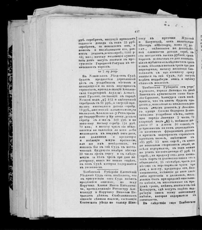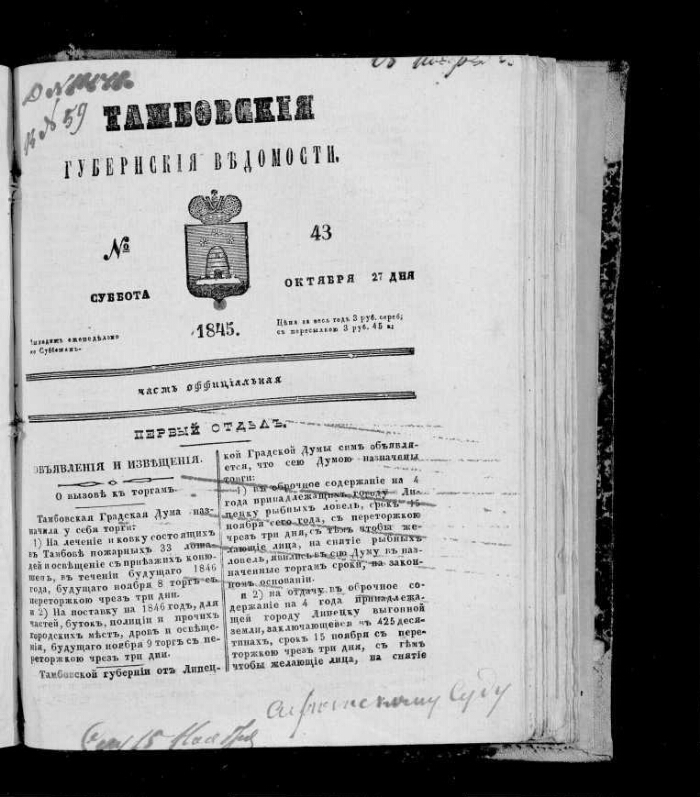 Tambov provincial statements.- 1838, January 8 - [?].-Tambov, 1838-1917.-The newspaper was published under the Tambov provincial rule since 1838. initially published weekly, from half of 1876 2 times a week, and from half of 1877 he went 3 times a week.From 1838 to March 1, 1907, 2 parts were published: official and unofficial;From 1838 to March 1845, the unofficial part was published as adding to the number.Bibliography: A pointer of articles placed in the informal department of the Tambov provincial statements for 1870 - 1877./ M. P. Grigorovsky;The pointer of articles placed in the informal department of the "Tambov provincial statements" for 1838 - 1840./ Solovsky V.V.;A pointer of articles placed in the informal department of the Tambov provincial statements for 1841-1842..1. Territory (collection).2. People (collection).3. Power (collection).4. Territory of Russia: Tambov region (collection).5. Domestic serial and continuing editions (collection).6. Tambov province - History - 19 - beginning.20 centuries.-- Periodicals.7. Russia - History - 19 - beginning.20 centuries.-- Periodicals.8. Newspapers - Russia - 19 - Nach.20 centuries ..BBK 63.3 (28-8TA) 52Я51BBK 63.3 (28-8TA) 53Y51BBK 63.3 (2) 52Я51BBK 63.3 (2) 53Y51Electronic Source: PBPlace of Storage Original: GATO1845, No. 43 (October 27).- 1845. - [15] p.: Tab .. -Ex.: No oblast, with a manus.litter..Electronic Source: PBPlace of Storage Original: GATO