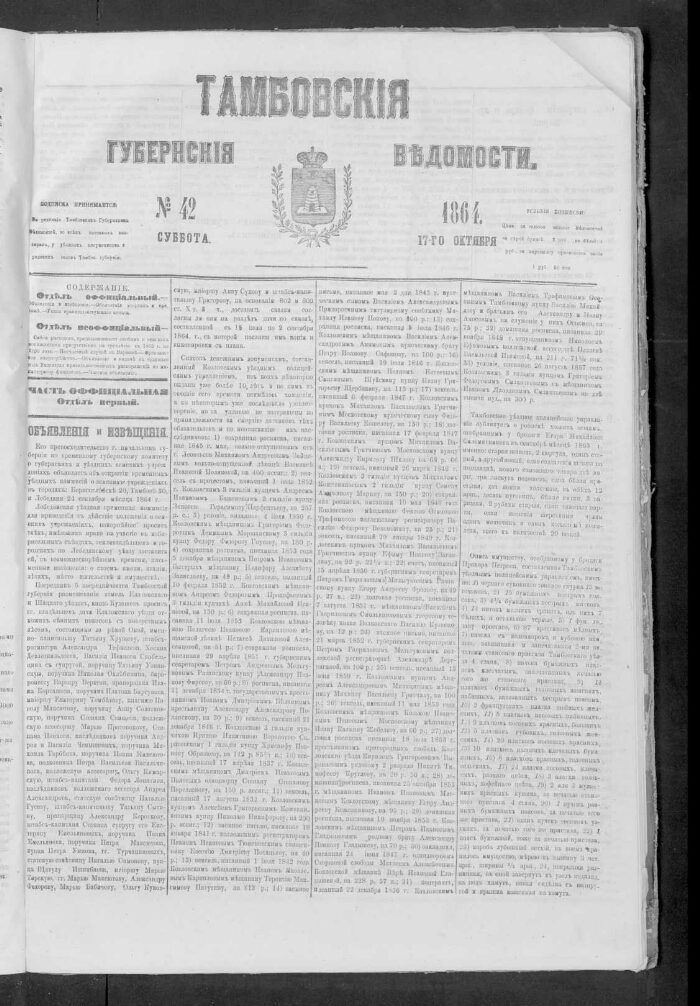 Description Publisher Тип. Губ. правления Collections Domestic periodicals in the Presidential Library’s collections → Newspapers → T → Tambovskie Gubernskie Vedomosti (Tambov Provincial News). Tambov, 1838-1917 → 1864 из 10