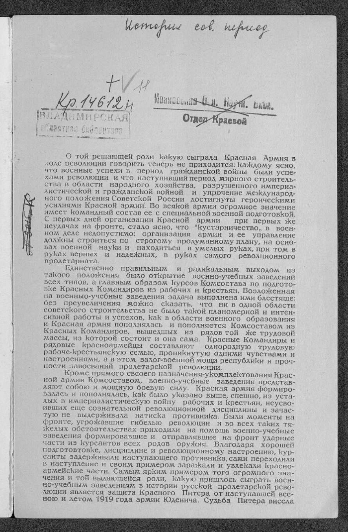 Report for the 2-year existence of the 9th infantry Vladimir SOV. Com. Courses Rab. Cr. Cr. Army. 1918-1920 - Vladimir: State Printing House No. 4, 1921. -16 pp. - Without a title page.