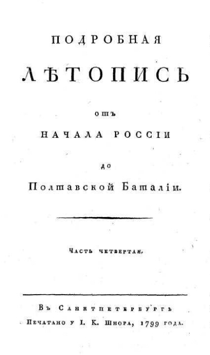 Detailed chronicle from the beginning of Russia to Poltava Batalia.- St. Petersburg: Pech.I.K.shnor, 1798-1799.- 8 °.-Circulation 1200 copies.Inc.At the expense of "Cabinet E. And. in.".Ed.ON.Lviv on the manuscript found by him in the Spaso-Evfimiyev monastery."Previation" ed.Signed initials: N.L.In the "pre-evolution", it is reported: "Skilled in domestic history and an unprofitable writer, the late Ivan Nikitich Botin, who assumed the work to correct the errors of the correspondencers of the first part, read the chronicle of this work of Metropolitan Feofan [Prokopovich].SK XVIII..I. FEOFAN (Prokopovich Ozerzar; Archiep. Novgorod and Narva; 1681-1736).II.Botin, Ivan Nikitich (1735-1792).Electronic copy source: RGBPart 4.- 1799. -VI, 200 s .. -Selo.To: Detailed chronicle from the beginning of Russia to Poltava Batlia, Part 3. - St. Petersburg, 1799..Electronic copy source: RGB