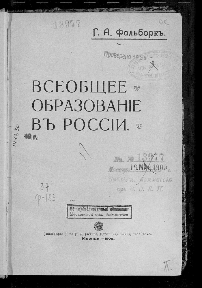 Author Фальборк Генрих Адольфович Description Falbork, Henry Adolfovich (1864-1942). General Education in Russia / G.А. Falbork. - Moscow: type. t-va ID Sytin, 1908. - [4], 212 p. ; 23. - . Source of the electronic copy: PB Publisher типография Товарищества И. Д. Сытина Catalogue object История образования и педагогической мысли в России и СССР Collections Gosudarika → Russian People → Коллекции → History of education in Russia → History of education in Russia → History of education in Russia in the 18th – early 20th centuries