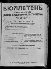 1937 No. 25. 10 September. - Publishing house of Lenoblispolkom and Lensoviet, 1937. -16 p. : tab. - . Issue: Bulletin of resolutions of the Leningrad Regional Executive Committee. Contents: Decrees of the Government of the USSR and the RSFSR. Decisions of the Leningrad Regional Executive Committee. Departmental orders and notifications. . -8,000 copies.