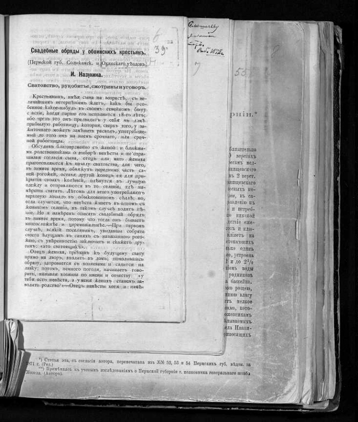 Author Назукин И. Description Nazukin, I. Wedding ceremonies at the obninsk peasants: (Perm Gubernia Solikam and Okhansk districts) / [Soch] I. Nazukina. - [Perm: Type. Perm. lips. reval., 1875]. -48 from .. - 4 From the number 75-78 "Perm Gubernia Ved." 1875 . Source of the electronic copy: PB Publisher Тип. Перм. губ. правл. Catalogue object Этнология отдельных территорий Collections Великая Россия → Коллекции → Коллекции → Cultural Heritage of the Peoples of Russia → Customs, Rituals, Holidays. Traditional Medicine and Cuisine → Life Cycle Rituals → Wedding Rituals and Customs → Individual Territories → Volga Federal District → Perm Territory Gosudarika → Territory of Russia → Коллекции → Регионы России → Perm Territory: pages of history → People → Culture