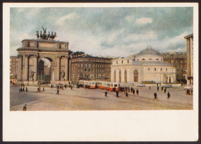 Leningrad.Stacked area.On the left - Narva Timpal Gate.Right - building station of the Metro "Narva" / Fot.B. Utkin.- Isogise, 1957. -postcard..Electronic copy source: Tretyakov Gallery