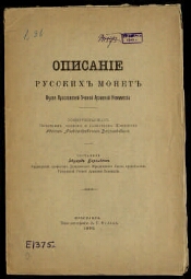 Description of the Russian coins of the Museum of the Yaroslavl Scientific Archive Commission, donated by the honorary member and treasurer of the Commission, Ivan Alexandrovich Vakhromeev / Comp. Edward Berendts hordes. prof. Demidov. jurid. lyceum, before. Lips. scientist. archive. commis. - Yaroslavl: Tipo-lit. E.G. Falk, 1898.-IV, 42 pp., 1 liter. yl. : tab. ; 25 cm. - Bibliography. in a substring. note