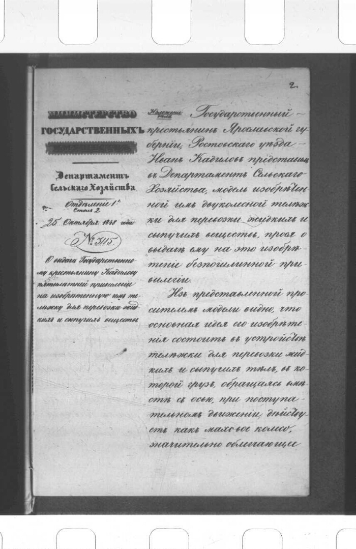 Title | The case of the issuance of a 5-year-old privilege by the state peasant Yaroslavl province, Rostov county, Ivan Kadilov, on the two-wheeled trolley invented by them for transportation of liquid and bulk substances |