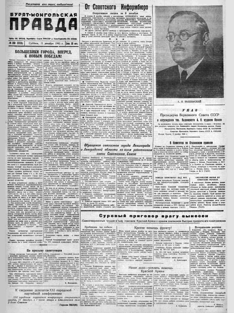 Buryat-Mongolian Truth: the Buryat-Mongol Oblast Committee of the CPSU (B.), The Supreme Council of the BMASR and Ulan-Ude City Committee of the CPSU (b). - Ulan-Ude, 1923-1958. - Titles: 1918 (June-August) Bulletin of the Soviets of the Baikal region; 1920, April - 1923 Worker and peasant of the Baikal region, Baikal region, Red Baikal region, Pribaikalskaya truth; 1923, September - 1958 The Buryat-Mongolian Truth; 1958- The truth of Buryatia. Podzag: 1941 organ of the Buryat-Mongolian OK of the CPSU (b), the Supreme Council of the BMASR and Ulan-Ude city committee of the CPSU (b); 1942-1945 Organ of the OK of the CPSU (B.), Of the Supreme Council of the BMASC, Ulan-Ude GC of the CPSU (B.). Place of publication: 1918 (June-August) - 1934 Verkhneudinsk. Publisher: 1942-1945 Printing house Gos. newspaper publication under the Council of People's Commissars of the BSSR. Also published in the Buryat language: Buryat-Mongolia unun. Founded on June 7, 1918