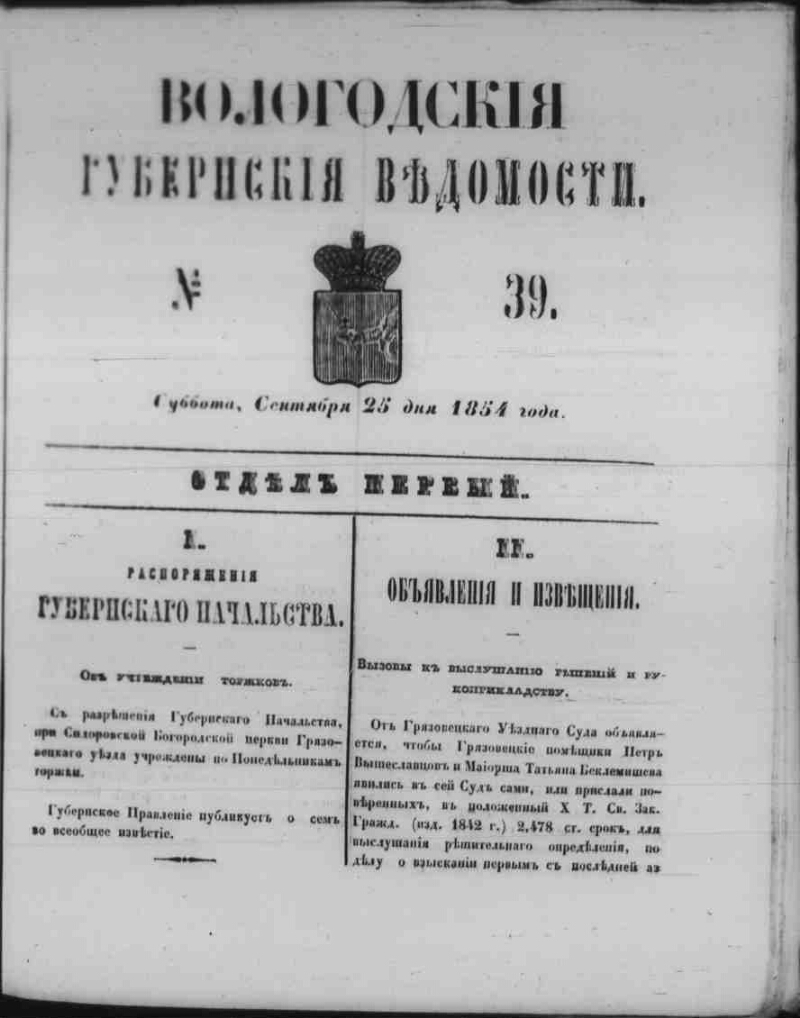 Vologda Provincial Gazette. - Vologda, 1838-1917 |