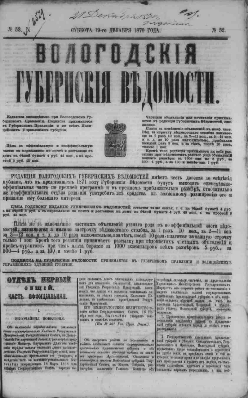 1870, No. 52 [Dec. 19]. - S. [1] -12, 2 seconds, 2 seconds, 2 seconds, 2 seconds. - In the room also: The painting of the town of Gryazovets for 1871; for Mr. Kadnikov; in the city of Velsk; on the Verkhovazh Posad
