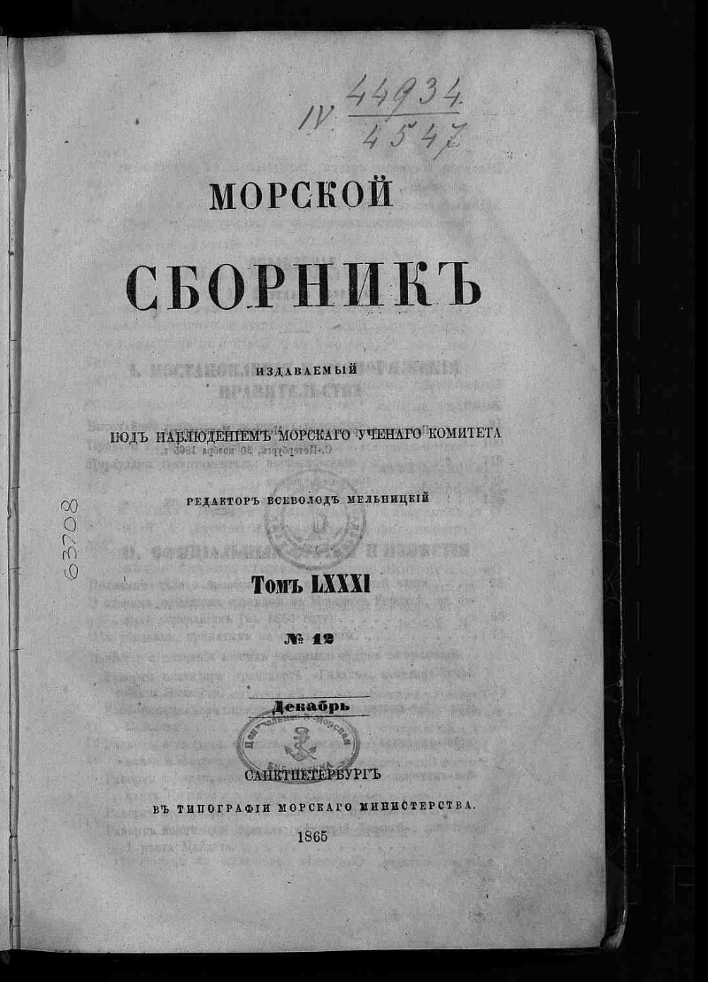 T 81, No. 12 / editor Vsevolod Melnitsky - 1865 - [470] with section: devil, silt, table - In the output: St. Petersburg At the printing house of the Naval Ministry From the content: Going on boats from Kronstadt to Revel From St. Petersburg Description of Moscow, Martynov's edition, and other materials - Bibliography in footnotes - A copy of the BIC with a stamp of the Mores Library of the Ministry