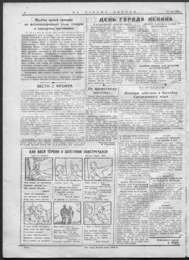 Guarding the Motherland: the newspaper of the Leningrad Military District. - 1918, May 1 -. - Leningrad, 1938-. - Title: 1918-1921 Red Army, Armed people, Fighting truth; 1921-1938 Red Star. Podzag: 1941 - the daily Red Army newspaper of the Leningrad Military District; 1945 - the daily Red Army newspaper of the Leningrad Front. Managing editor: 1945 - M. Gordon. Address: 1945 - Field mail 22245 A. The first issue of the newspaper "On Guard of the Motherland" was published May 1, 1918 under the name "Red Army". Later the newspaper came out under different names: "Armed People", "Fighting Truth", and from November 10, 1921 - "Red Star", as a printed organ of the Petrograd Military District. The title "Guardian of the Motherland" appears on February 4, 1938, when the newspaper becomes the organ of the Leningrad Military District. On April 7, 1940, the newspaper "On the Guard of the Motherland" was awarded the first of the district newspapers with a high award - the Order of the Red Banner. On her pages were printed satirical articles about soldiers' everyday life during the Soviet-Finnish war of 1939-1940, signed by the pseudonym Vasya Terkin - a character created by members of the editorial board of the newspaper consisting of A. Tvardovsky, N. Tikhonov, S. Vashentsev, V. Sayanov and others. Since the beginning of the Great Patriotic War, the district newspaper has become a front-line newspaper. Since November 2010 - the printed organ of the Western Military District, the newspaper "On Guard of the Motherland", is published as a regional tab to the central publication of the Ministry of Defense of the Russian Federation to the newspaper "Krasnaya Zvezda". Frequency of output 1 time per week, on Saturdays