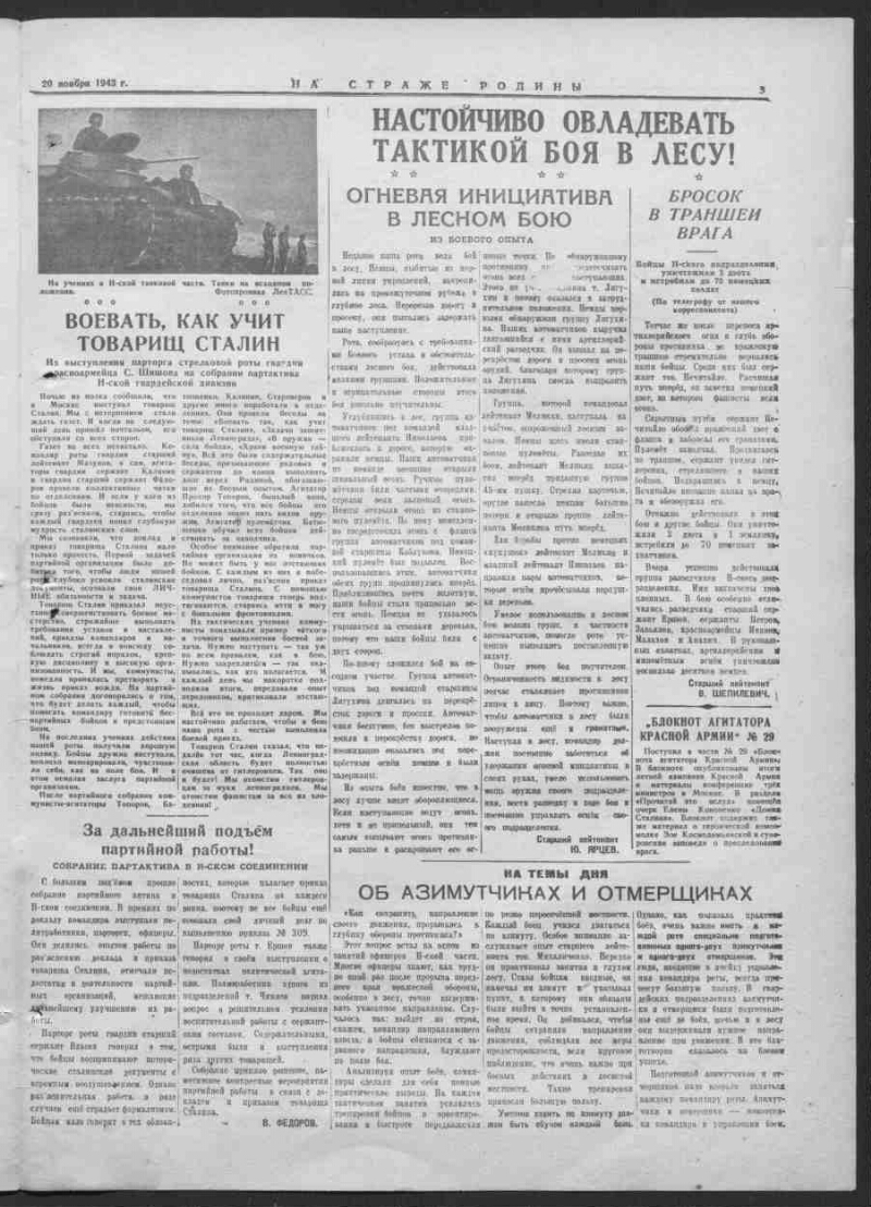 Guarding the Motherland: the newspaper of the Leningrad Military District. - 1918, May 1 -. - Leningrad, 1938-. - Title: 1918-1921 Red Army, Armed people, Fighting truth; 1921-1938 Red Star. Podzag: 1941 - the daily Red Army newspaper of the Leningrad Military District; 1945 - the daily Red Army newspaper of the Leningrad Front. Managing editor: 1945 - M. Gordon. Address: 1945 - Field mail 22245 A. The first issue of the newspaper "On Guard of the Motherland" was published May 1, 1918 under the name "Red Army". Later the newspaper came out under different names: "Armed People", "Fighting Truth", and from November 10, 1921 - "Red Star", as a printed organ of the Petrograd Military District. The title "Guardian of the Motherland" appears on February 4, 1938, when the newspaper becomes the organ of the Leningrad Military District. On April 7, 1940, the newspaper "On the Guard of the Motherland" was awarded the first of the district newspapers with a high award - the Order of the Red Banner. On her pages were printed satirical articles about soldiers' everyday life during the Soviet-Finnish war of 1939-1940, signed by the pseudonym Vasya Terkin - a character created by members of the editorial board of the newspaper consisting of A. Tvardovsky, N. Tikhonov, S. Vashentsev, V. Sayanov and others. Since the beginning of the Great Patriotic War, the district newspaper has become a front-line newspaper. Since November 2010 - the printed organ of the Western Military District, the newspaper "On Guard of the Motherland", is published as a regional tab to the central publication of the Ministry of Defense of the Russian Federation to the newspaper "Krasnaya Zvezda". Frequency of output 1 time per week, on Saturdays