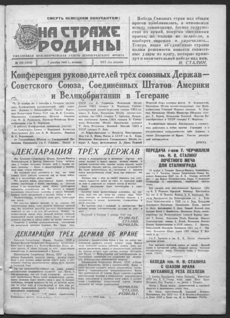 Guarding the Motherland: the newspaper of the Leningrad Military District. - 1918, May 1 -. - Leningrad, 1938-. - Title: 1918-1921 Red Army, Armed people, Fighting truth; 1921-1938 Red Star. Podzag: 1941 - the daily Red Army newspaper of the Leningrad Military District; 1945 - the daily Red Army newspaper of the Leningrad Front. Managing editor: 1945 - M. Gordon. Address: 1945 - Field mail 22245 A. The first issue of the newspaper "On Guard of the Motherland" was published May 1, 1918 under the name "Red Army". Later the newspaper came out under different names: "Armed People", "Fighting Truth", and from November 10, 1921 - "Red Star", as a printed organ of the Petrograd Military District. The title "Guardian of the Motherland" appears on February 4, 1938, when the newspaper becomes the organ of the Leningrad Military District. On April 7, 1940, the newspaper "On the Guard of the Motherland" was awarded the first of the district newspapers with a high award - the Order of the Red Banner. On her pages were printed satirical articles about soldiers' everyday life during the Soviet-Finnish war of 1939-1940, signed by the pseudonym Vasya Terkin - a character created by members of the editorial board of the newspaper consisting of A. Tvardovsky, N. Tikhonov, S. Vashentsev, V. Sayanov and others. Since the beginning of the Great Patriotic War, the district newspaper has become a front-line newspaper. Since November 2010 - the printed organ of the Western Military District, the newspaper "On Guard of the Motherland", is published as a regional tab to the central publication of the Ministry of Defense of the Russian Federation to the newspaper "Krasnaya Zvezda". Frequency of output 1 time per week, on Saturdays