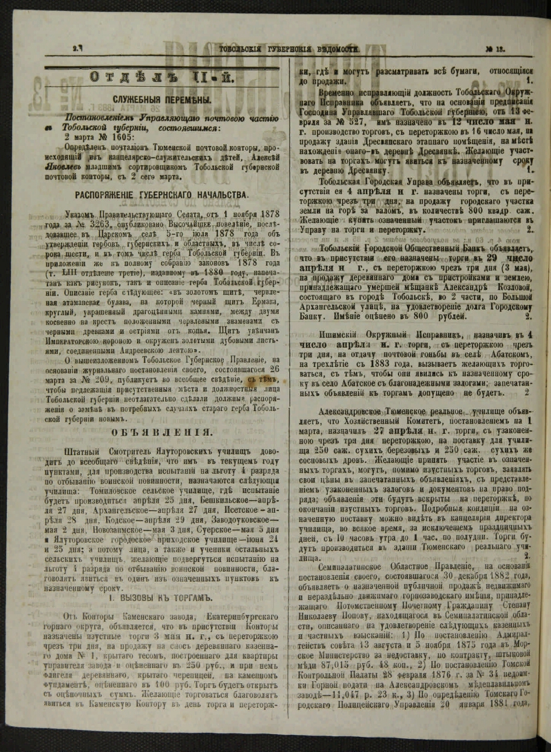 Tobolsk Province Gazette. - 1857, 27 Apr. - 1918, 3 April. - Tobolsk, 1857-1918. - Exit at 2 o'clock: Offic. and neophytes; from 1893 to 1897 both parts of the ed. Separately. Прил .: Yearbook of the Tobolsk provincial museum. Issue. 7-8. 1896-1897; Manuscripts of the library of the Tobolsk Province Museum in the 17th and first quarter of the 18th century. 1645-1676. (Issue 2). 1896; Department of Agriculture and Handicraft Industry. 1896-1906; The school department at the informal part of the Tobolsk Province Gazette. 1907-1917; Ad. to Dep. numbers. Decree: for the years 1858-1867, 1893.