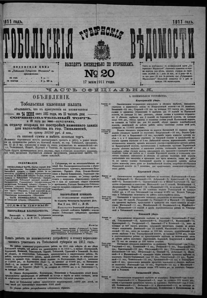 Tobolsk Province Gazette. - 1857, 27 Apr. - 1918, 3 April. - Tobolsk, 1857-1918. - Exit at 2 o'clock: Offic. and neophytes; from 1893 to 1897 both parts of the ed. Separately. Прил .: Yearbook of the Tobolsk provincial museum. Issue. 7-8. 1896-1897; Manuscripts of the library of the Tobolsk Province Museum in the 17th and first quarter of the 18th century. 1645-1676. (Issue 2). 1896; Department of Agriculture and Handicraft Industry. 1896-1906; The school department at the informal part of the Tobolsk Province Gazette. 1907-1917; Ad. to Dep. numbers. Decree: for the years 1858-1867, 1893.