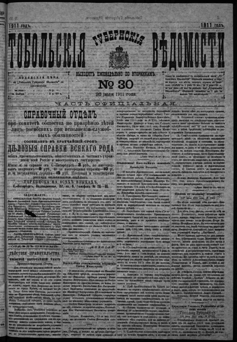 Tobolsk Province Gazette. - 1857, 27 Apr. - 1918, 3 April. - Tobolsk, 1857-1918. - Exit at 2 o'clock: Offic. and neophytes; from 1893 to 1897 both parts of the ed. Separately. Прил .: Yearbook of the Tobolsk provincial museum. Issue. 7-8. 1896-1897; Manuscripts of the library of the Tobolsk Province Museum in the 17th and first quarter of the 18th century. 1645-1676. (Issue 2). 1896; Department of Agriculture and Handicraft Industry. 1896-1906; The school department at the informal part of the Tobolsk Province Gazette. 1907-1917; Ad. to Dep. numbers. Decree: for the years 1858-1867, 1893.