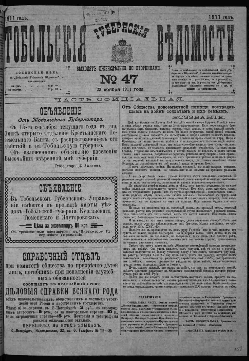Tobolsk Province Gazette. - 1857, 27 Apr. - 1918, 3 April. - Tobolsk, 1857-1918. - Exit at 2 o'clock: Offic. and neophytes; from 1893 to 1897 both parts of the ed. Separately. Прил .: Yearbook of the Tobolsk provincial museum. Issue. 7-8. 1896-1897; Manuscripts of the library of the Tobolsk Province Museum in the 17th and first quarter of the 18th century. 1645-1676. (Issue 2). 1896; Department of Agriculture and Handicraft Industry. 1896-1906; The school department at the informal part of the Tobolsk Province Gazette. 1907-1917; Ad. to Dep. numbers. Decree: for the years 1858-1867, 1893.