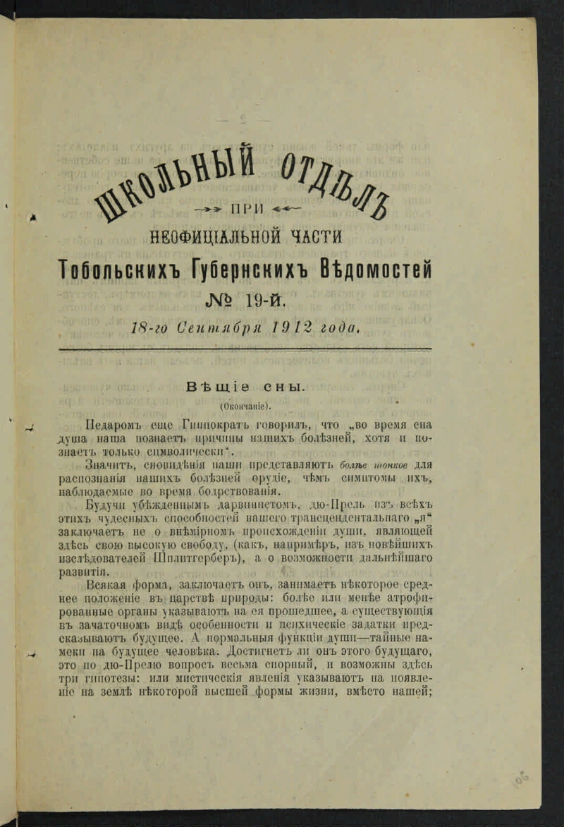 The school department at the informal part of the Tobolsk Province Gazette. - 1907, No. 1 (September 3) - 1917, No. 15 (December 12). - Tobolsk, 1907, September 3 - 1917, [December]. - It appears as a separate supplement to the unofficial part of the "Tobolsk Provincial Gazette."