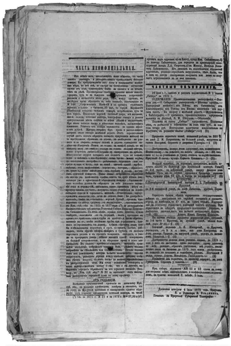 Description Irkutsk Province Gazette . - Irkutsk: Irkutsk provincial government, 1857- 1875, No. 53. - 4 p. . 1. History - Periodicals - Russia BBC 63.3 (28-8 Irk) 522n51 Source of the copy: Irkutsk OGUNB Location on the original: Иркутская ОГУНБ Publisher Иркутское губернское правление Catalogue object История Collections Domestic periodicals in the Presidential Library’s collections → Newspapers → I → Irkutskie Gubernskie Vedomosti (Irkutsk Provincial News). Irkutsk → 1875