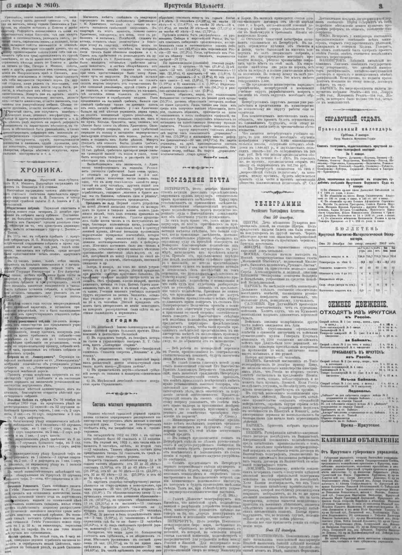 Description Irkutsk Province Gazette . - Irkutsk: Irkutsk provincial government, 1857- 1904, No. 3610 (Jan. 3). - 4 s. . 1. History - Periodicals - Russia. 2. Irkutsk Province. BBC 63.3 (28-8Irk) 531n51 Source of electronic copy: Irkutsk OGUNB Location on the original: Иркутская ОГУНБ Publisher Иркутское губернское правление Catalogue object История Collections Domestic periodicals in the Presidential Library’s collections → Newspapers → I → Irkutskie Gubernskie Vedomosti (Irkutsk Provincial News). Irkutsk → 1904
