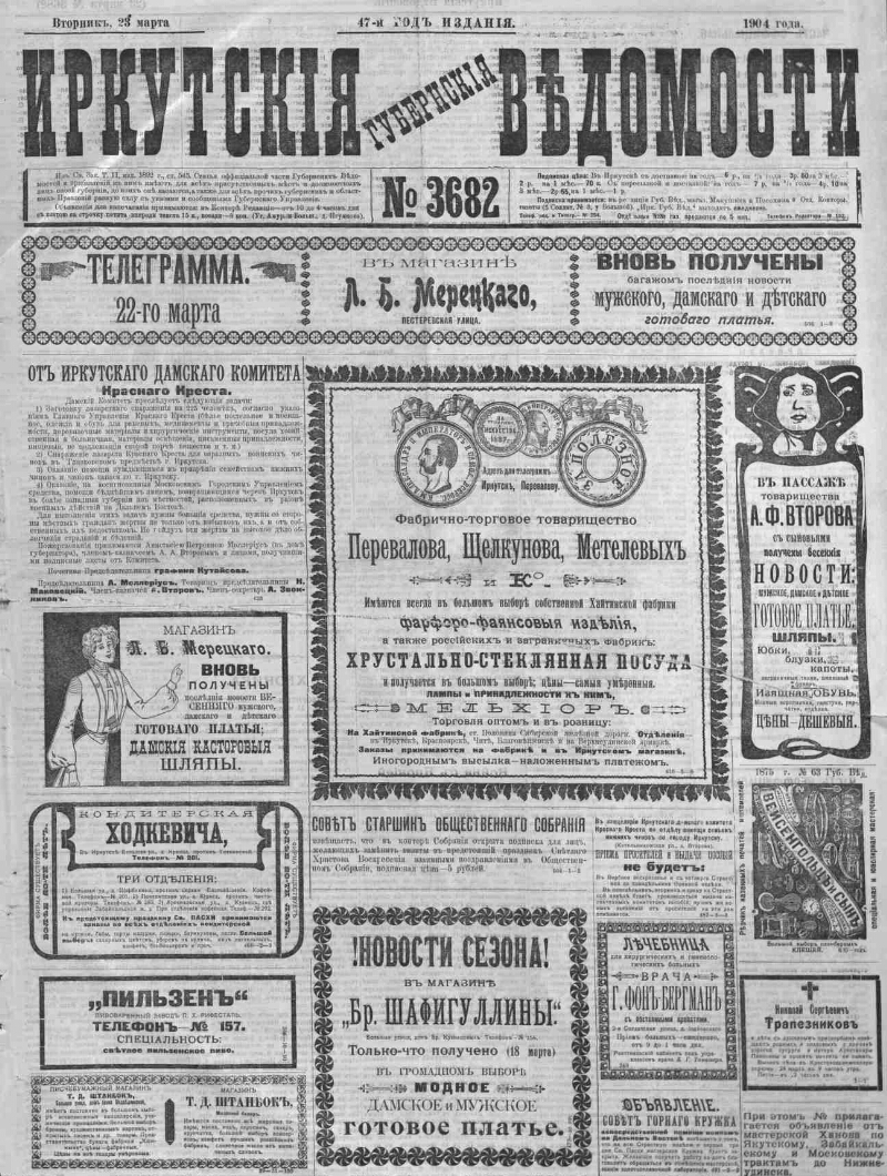 Description Irkutsk Province Gazette . - Irkutsk: Irkutsk provincial government, 1857- 1904, No. 3682 (March 23). - 4 s. . 1. History - Periodicals - Russia. 2. Irkutsk Province. BBC 63.3 (28-8Irk) 531n51 Source of electronic copy: Irkutsk OGUNB Location on the original: Иркутская ОГУНБ Publisher Иркутское губернское правление Catalogue object История Collections Domestic periodicals in the Presidential Library’s collections → Newspapers → I → Irkutskie Gubernskie Vedomosti (Irkutsk Provincial News). Irkutsk → 1904