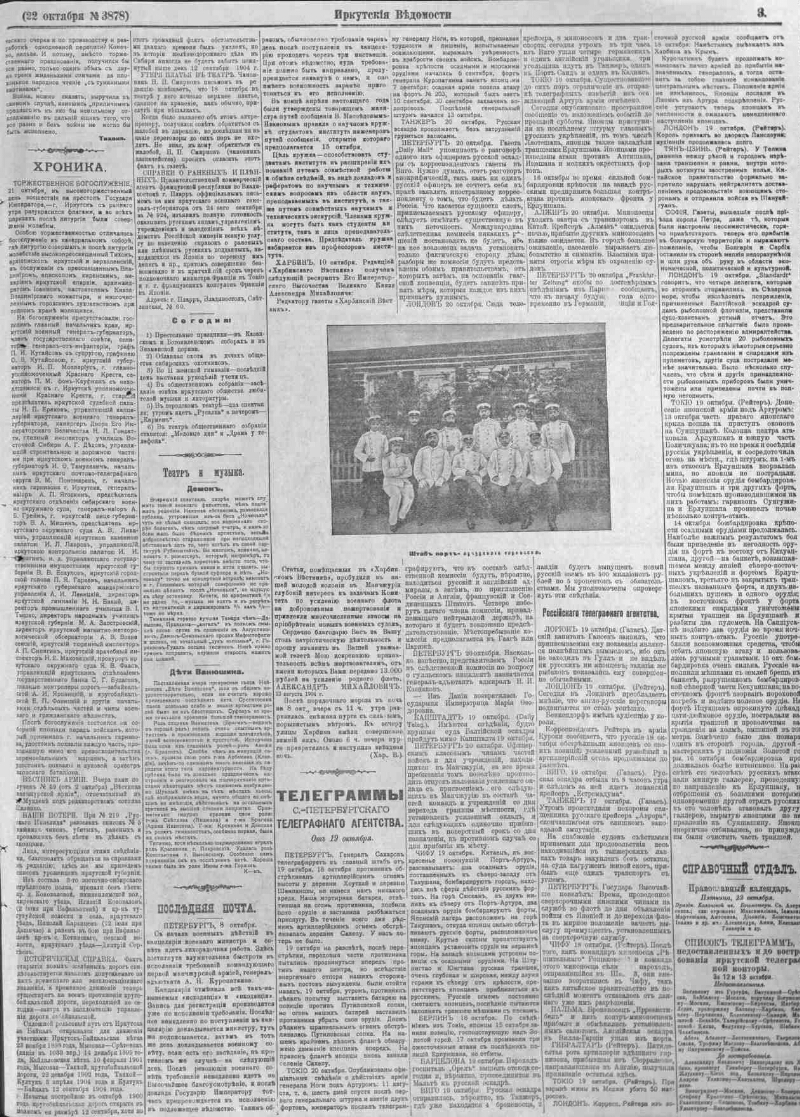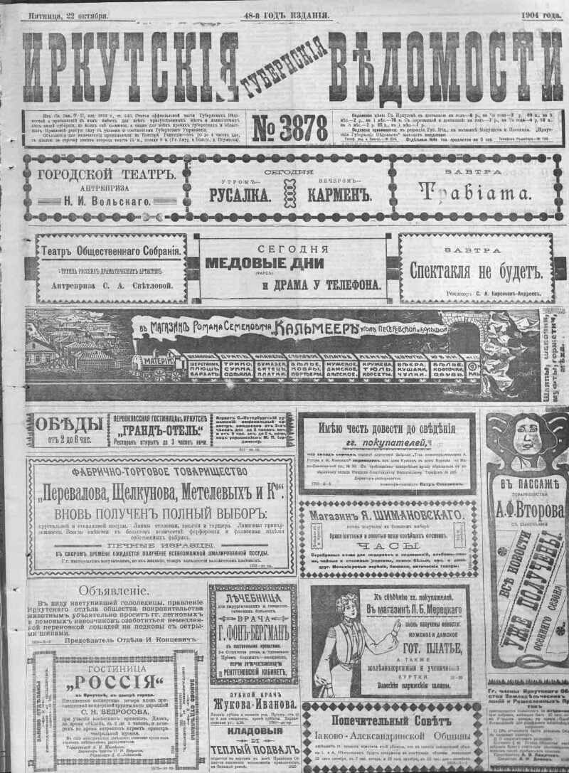 Description Irkutsk Province Gazette . - Irkutsk: Irkutsk provincial government, 1857- 1904, No. 3878 (Oct. 22). - 4 s. . 1. History - Periodicals - Russia. 2. Irkutsk Province. BBC 63.3 (28-8Irk) 531n51 Source of electronic copy: Irkutsk OGUNB Location on the original: Иркутская ОГУНБ Publisher Иркутское губернское правление Catalogue object История Collections Domestic periodicals in the Presidential Library’s collections → Newspapers → I → Irkutskie Gubernskie Vedomosti (Irkutsk Provincial News). Irkutsk → 1904