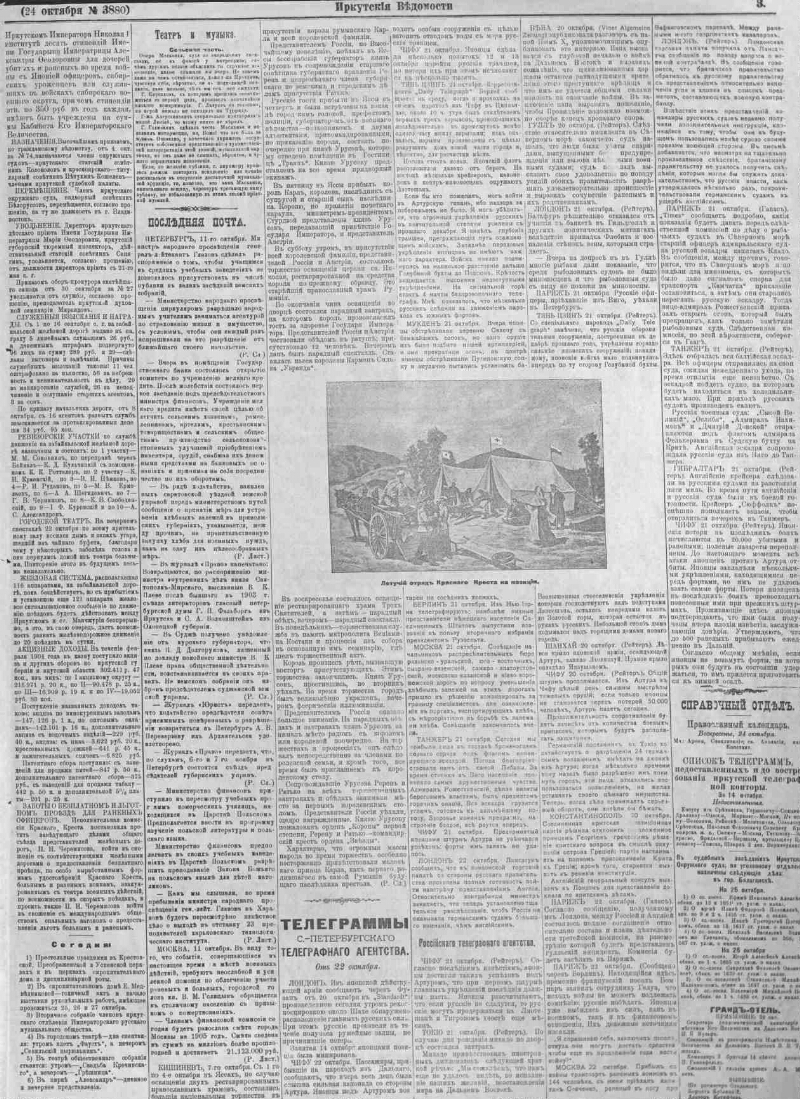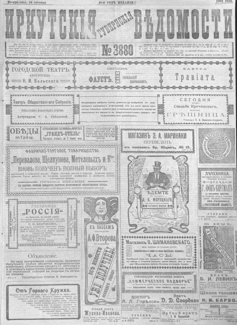 Description Irkutsk Province Gazette . - Irkutsk: Irkutsk provincial government, 1857- 1904, No. 3880 (Oct. 24). - 4 s. . 1. History - Periodicals - Russia. 2. Irkutsk Province. BBC 63.3 (28-8Irk) 531n51 Source of electronic copy: Irkutsk OGUNB Location on the original: Иркутская ОГУНБ Publisher Иркутское губернское правление Catalogue object История Collections Domestic periodicals in the Presidential Library’s collections → Newspapers → I → Irkutskie Gubernskie Vedomosti (Irkutsk Provincial News). Irkutsk → 1904