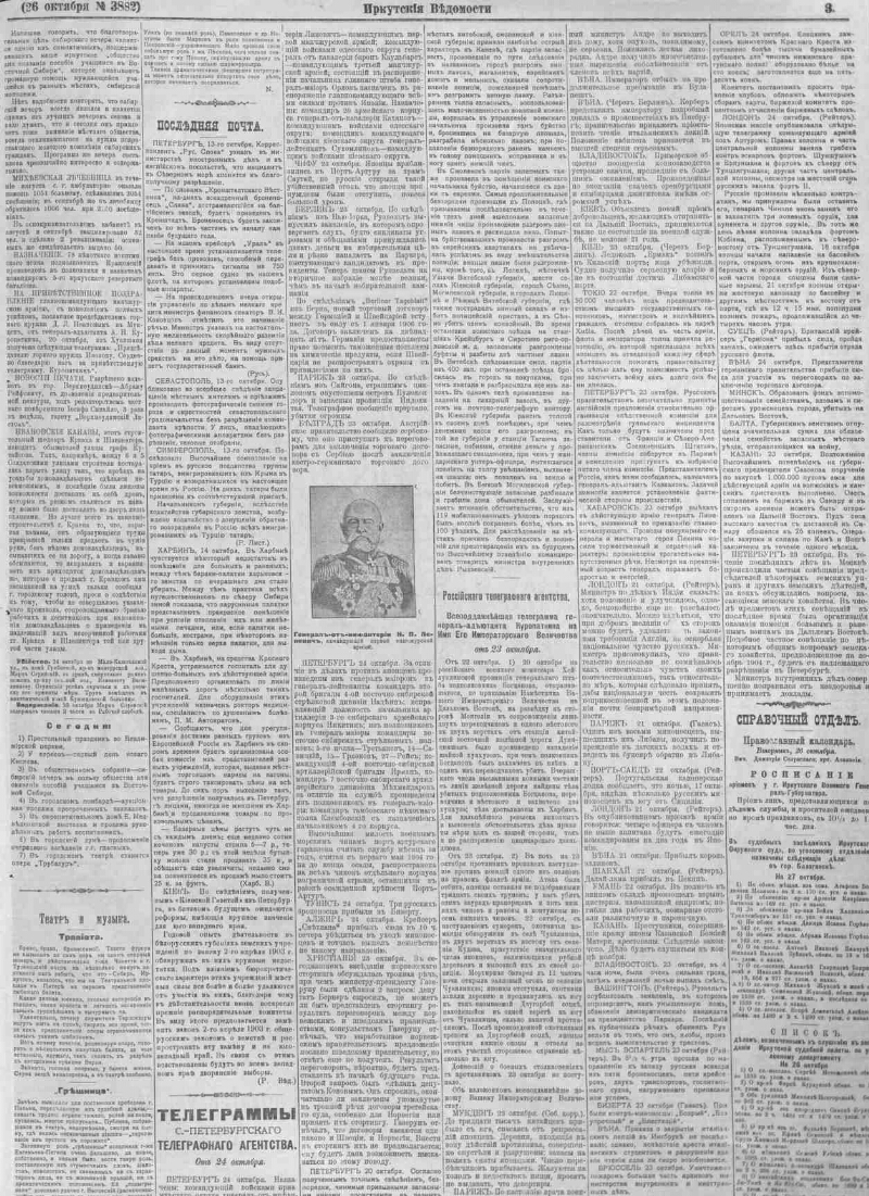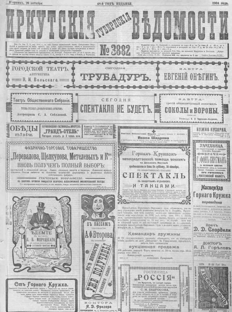Description Irkutsk Province Gazette . - Irkutsk: Irkutsk provincial government, 1857- 1904, No. 3882 (Oct. 26). - 4 s. . 1. History - Periodicals - Russia. 2. Irkutsk Province. BBC 63.3 (28-8Irk) 531n51 Source of electronic copy: Irkutsk OGUNB Location on the original: Иркутская ОГУНБ Publisher Иркутское губернское правление Catalogue object История Collections Domestic periodicals in the Presidential Library’s collections → Newspapers → I → Irkutskie Gubernskie Vedomosti (Irkutsk Provincial News). Irkutsk → 1904