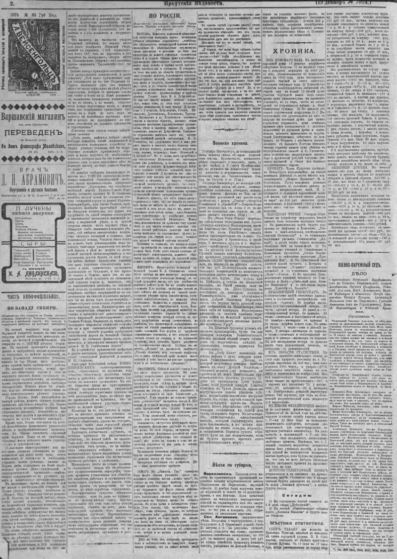 Description Irkutsk Province Gazette . - Irkutsk: Irkutsk provincial government, 1857- 1904, No. 3934 (Dec. 19). - 4 s. . 1. History - Periodicals - Russia. 2. Irkutsk Province. BBC 63.3 (28-8Irk) 531n51 Source of electronic copy: Irkutsk OGUNB Location on the original: Иркутская ОГУНБ Publisher Иркутское губернское правление Catalogue object История Collections Domestic periodicals in the Presidential Library’s collections → Newspapers → I → Irkutskie Gubernskie Vedomosti (Irkutsk Provincial News). Irkutsk → 1904