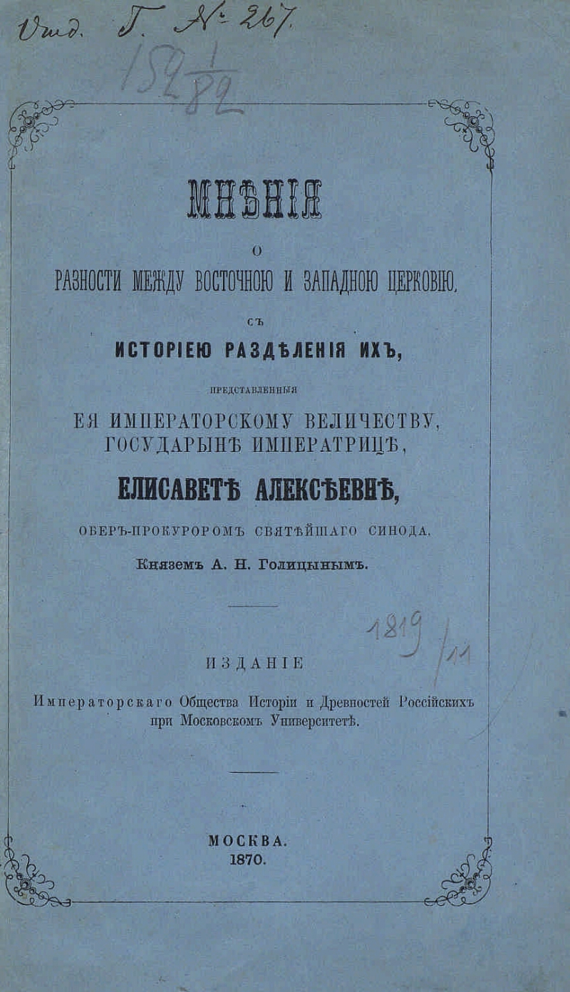 Opinions on the difference between the eastern and western church, with a history of their division, presented to Her Imperial Majesty, the Empress Elizabeth Alekseevna, the Chief Procurator of the Holy Synod, Prince A. N. Golitsyn. - Moscow: Publication of the Imperial Society of Russian History and Antiquities at Moscow University, 1870. - [2], VI, 44 p. ; 26 cm. - Author of the preface: O. Bodiansky. An impression from the "Reading in the O-ve of History and Antiquities was growing under the Moscow University". 1870. Book. 1.