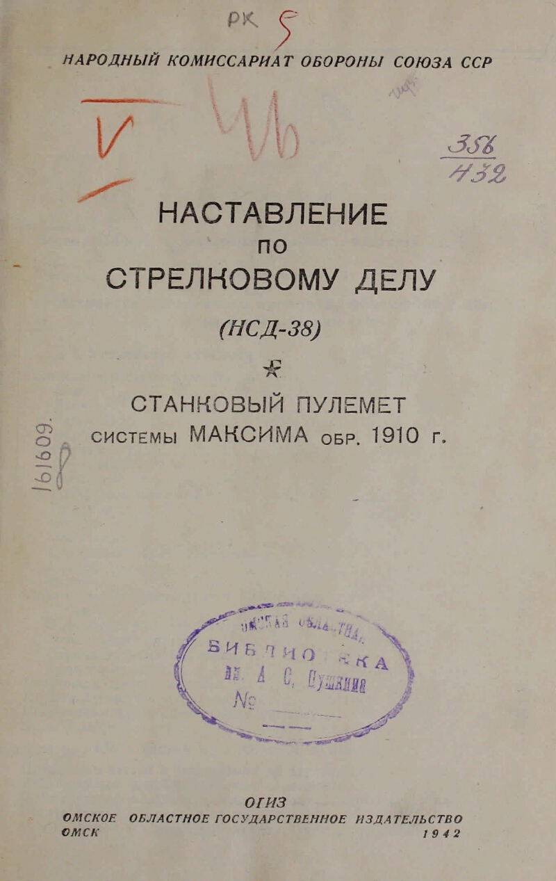 Manual on small business (NSD-38): Machine gun of the Maxim system of the formation] 1910 / Nar. commissariat of defense of the USSR. - Omsk: OGIZ: OMGIS, 1942. - 240, [8] p. : ill., Table. ; 19. - 10,000 copies. - (Per.)