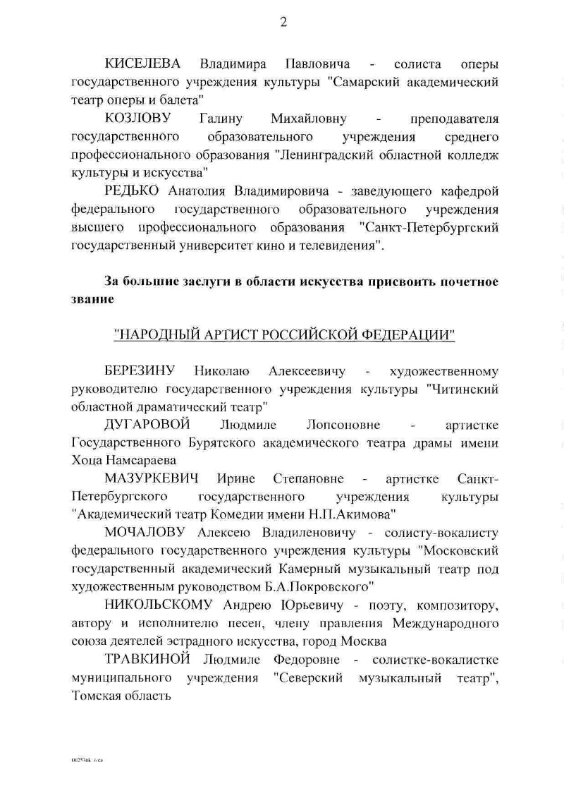 For the great contribution to the development of the national culture and art, to reward many years of creative activity ...; For merits in the development of culture and art, many years of fruitful activity to reward ...; For the great merits in the field of art, to confer the honorary title ...; For the merits in the field of art, to confer honorary titles ...; For merits in scientific and pedagogical activity and preparation of highly skilled experts to appropriate an honorary title ...; For the merits in the field of fine arts, to confer the honorary title ...; For merits in the field of culture and long-term fruitful work to appropriate an honorary title ... |