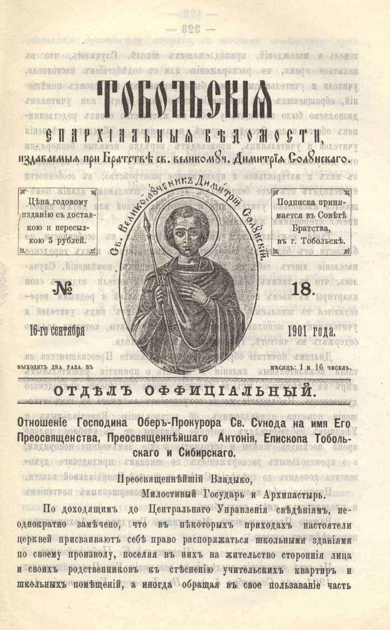 № 18 / ed. N. Gorodkov. - Tobolsk, 1901. - Contents: The official department (pages 322-335); The unofficial department (pages 427-441); School sheet under the Tobolsk diocesan statements (pages 131-136); [Report of the Tobolsk Diocesan Committee of the Orthodox Missionary Society] (pages 33 to 40).