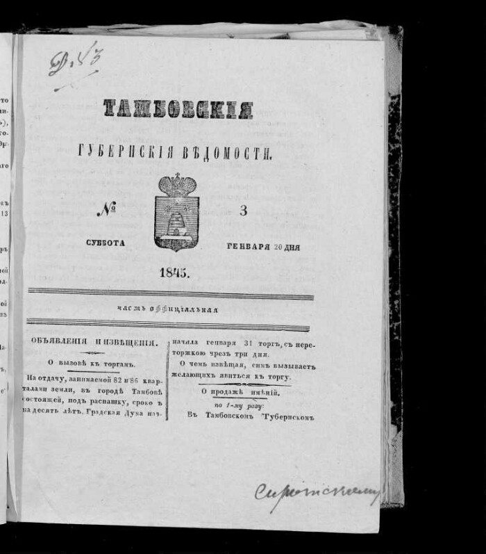 Tambov provincial statements.Tambov, 1838-1917.1845, № 3 (January 20).1845.
