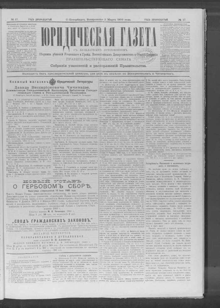 Юридическая газета : выходит без предварительной цензуры. - 1892, 4 января - [1906]. -Санкт-Петербург, 1892-1906. - "Юридическая газета" с бесплатным приложением Сборника решений Уголовного и Гражданского департаментов и общего собрания правительствующего сената, а с 1895 и Собраний узаконении и распоряжений правительства - выходила в Петербурге с января 1892 по 1906, 2 раза в неделю, по воскресеньям и четвергам. Редакторы - Е. Антонов, Д. В. Чичинадзе, М. В. Чичинадзе. Материалы газеты печатались под рубриками: Законодательная хроника в России, Обзор постановлений отечественного и иностранного законодательства, Статьи и заметки по вопросам, возникающим в судебной и административной практике, Корреспонденции из России, Выдающиеся судебные процессы, Речи известных адвокатов. С № 6 1906 стала выходить в виде брошюр. Алфавитный указатель статей за 1901 год: в № 32 за 30 декабря 1901 г.. - Алфавитный указатель к "Юридической газете" за 1892 и 1893 гг. - Санкт-Петербург, 1894. - Приложения: "Сборник решений Уголовного и Гражданского кассационных департаментов и Общего собрания Правительствующего сената" и "Собрание узаконений и распоряжений Правительства".