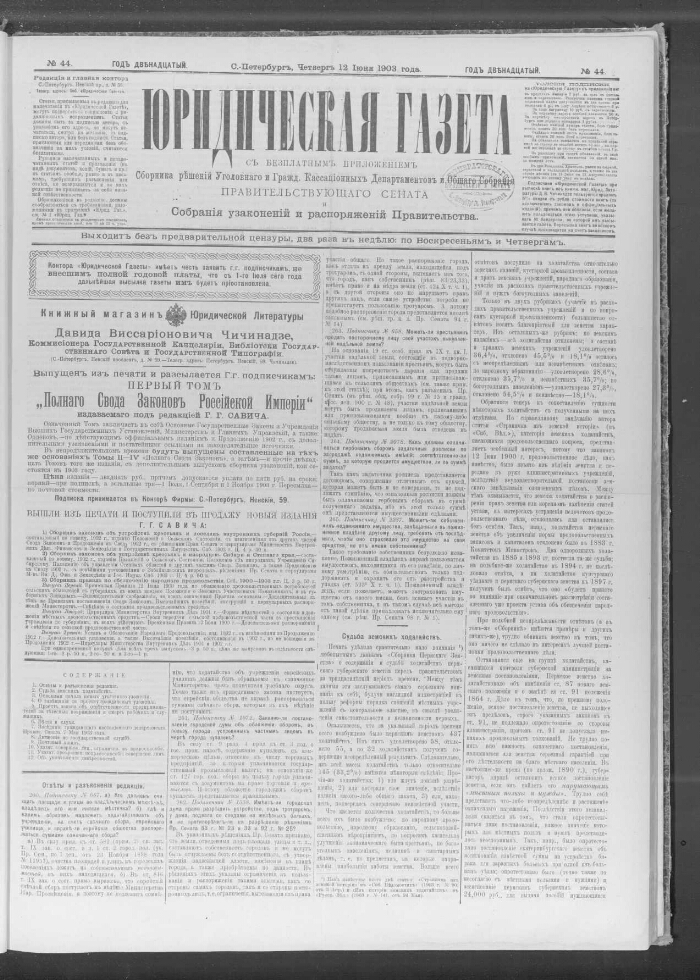 Юридическая газета : выходит без предварительной цензуры. - 1892, 4 января - [1906]. -Санкт-Петербург, 1892-1906. - "Юридическая газета" с бесплатным приложением Сборника решений Уголовного и Гражданского департаментов и общего собрания правительствующего сената, а с 1895 и Собраний узаконении и распоряжений правительства - выходила в Петербурге с января 1892 по 1906, 2 раза в неделю, по воскресеньям и четвергам. Редакторы - Е. Антонов, Д. В. Чичинадзе, М. В. Чичинадзе. Материалы газеты печатались под рубриками: Законодательная хроника в России, Обзор постановлений отечественного и иностранного законодательства, Статьи и заметки по вопросам, возникающим в судебной и административной практике, Корреспонденции из России, Выдающиеся судебные процессы, Речи известных адвокатов. С № 6 1906 стала выходить в виде брошюр. Алфавитный указатель статей за 1901 год: в № 32 за 30 декабря 1901 г.. - Алфавитный указатель к "Юридической газете" за 1892 и 1893 гг. - Санкт-Петербург, 1894. - Приложения: "Сборник решений Уголовного и Гражданского кассационных департаментов и Общего собрания Правительствующего сената" и "Собрание узаконений и распоряжений Правительства".