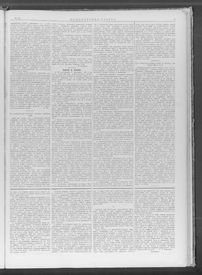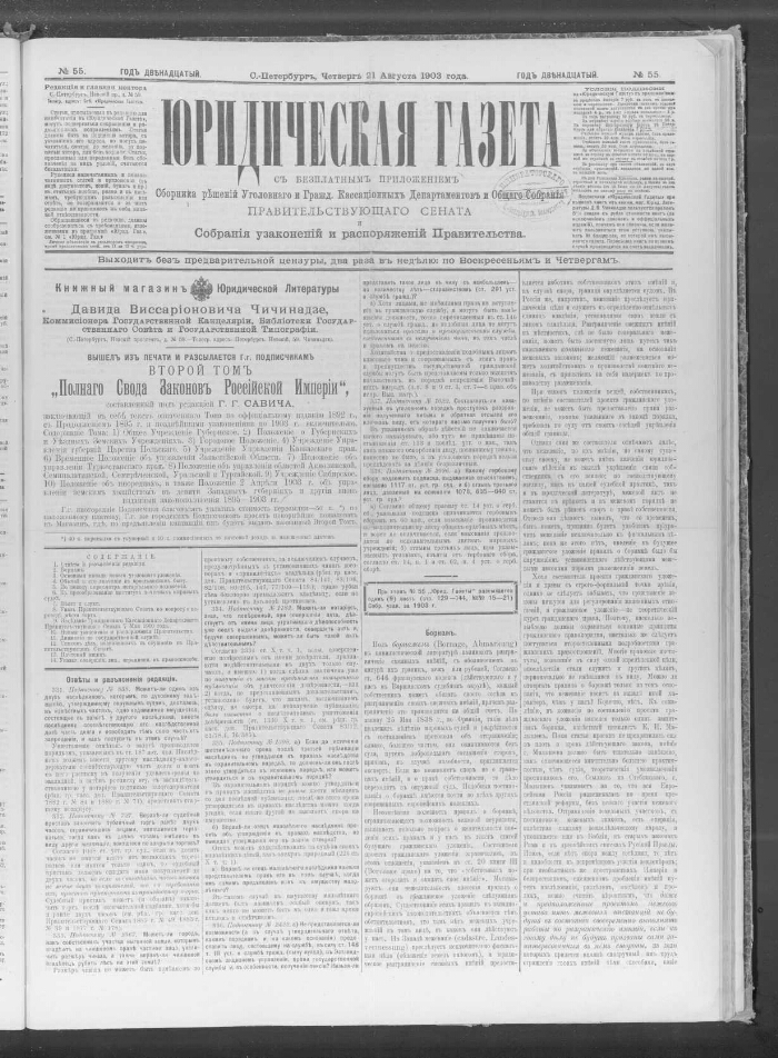 Юридическая газета : выходит без предварительной цензуры. - 1892, 4 января - [1906]. -Санкт-Петербург, 1892-1906. - "Юридическая газета" с бесплатным приложением Сборника решений Уголовного и Гражданского департаментов и общего собрания правительствующего сената, а с 1895 и Собраний узаконении и распоряжений правительства - выходила в Петербурге с января 1892 по 1906, 2 раза в неделю, по воскресеньям и четвергам. Редакторы - Е. Антонов, Д. В. Чичинадзе, М. В. Чичинадзе. Материалы газеты печатались под рубриками: Законодательная хроника в России, Обзор постановлений отечественного и иностранного законодательства, Статьи и заметки по вопросам, возникающим в судебной и административной практике, Корреспонденции из России, Выдающиеся судебные процессы, Речи известных адвокатов. С № 6 1906 стала выходить в виде брошюр. Алфавитный указатель статей за 1901 год: в № 32 за 30 декабря 1901 г.. - Алфавитный указатель к "Юридической газете" за 1892 и 1893 гг. - Санкт-Петербург, 1894. - Приложения: "Сборник решений Уголовного и Гражданского кассационных департаментов и Общего собрания Правительствующего сената" и "Собрание узаконений и распоряжений Правительства".