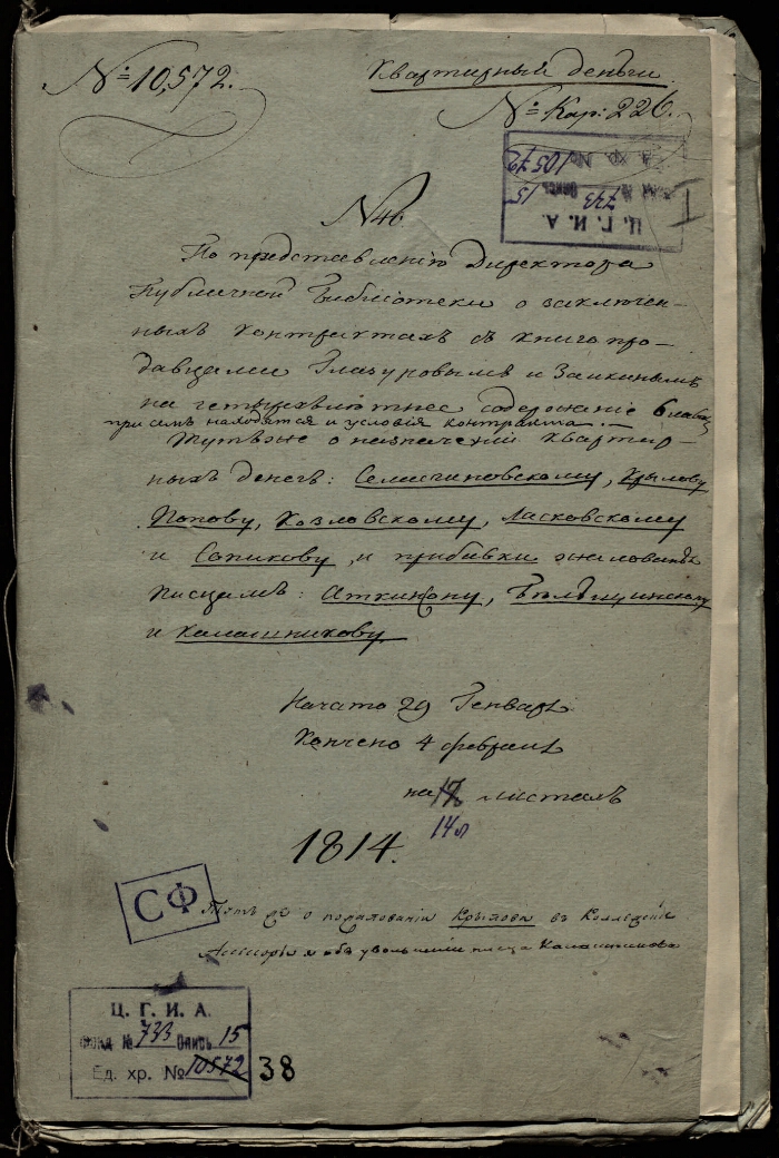 | Заголовок | Дела о заключении контракта с книгопродавцами И. Глазуновым и И. Заикиным на содержание книжных лавок, о награждении чином И. А. Крылова, об увеличении жалованья писцам А. Бельщинскому, В. Я. Аткинсону, Калашникову и об увольнении последнего |