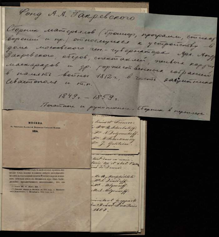 Заголовок | Сборник материалов (брошюр, программ, стихотворений и прочее), относящихся к устройству в доме московского генерал-губернатора Арсения Андреевича Закревского обедов, спектаклей, живых картин, маскарадов и других торжественных собраний в память войны 1812 года, в честь защитников Севастополя и тому подобное |